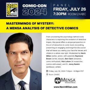 JUL’24: For the fourth time, Nevin was asked to speak on a panel at COMIC-CON 2024. This time he will also lead the panel as the moderator. On behalf of Mensa, he joins other esteemed panelists to discuss “Masterminds of Mystery: A Mensa Analysis of Detective Comics”. If you’re going to be at SDCC ’24, come check out the panel Friday, July 26, 2024 7:30pm.